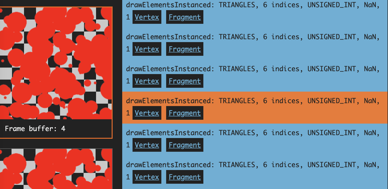 };Using Spector.js, which was introduced in the first lesson, you can see that there are a large number of drawing commands. I've filtered down to the drawElements command, and in fact each circle corresponds to a number of WebGL commands (including the creation of buffers, etc.).