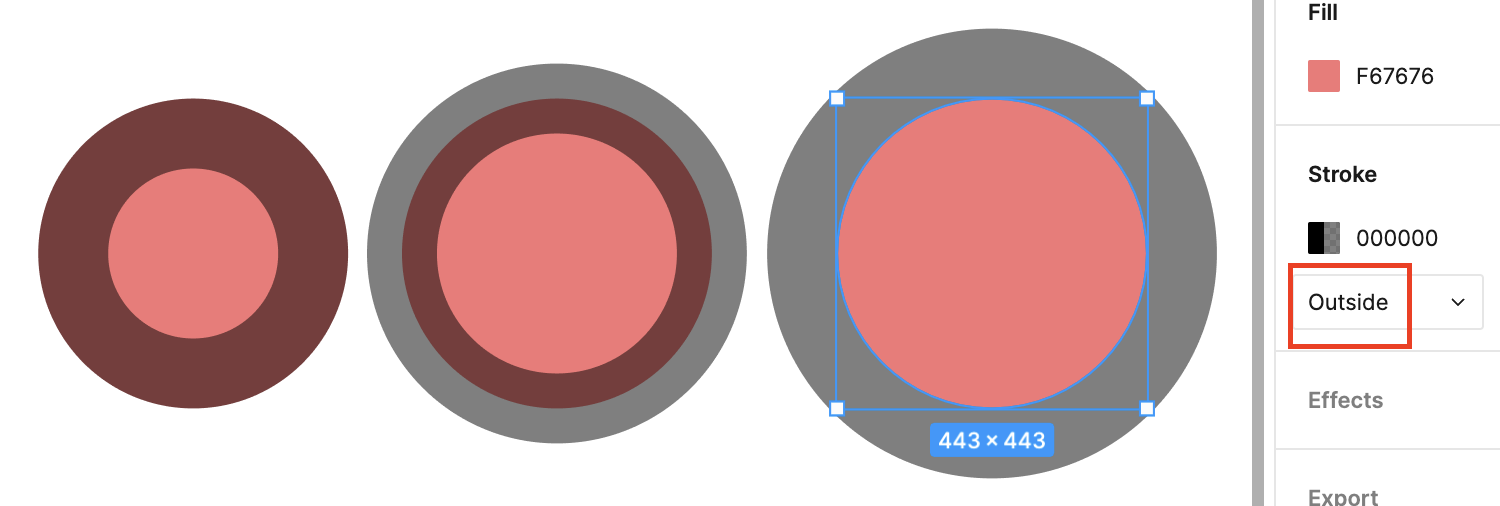 The corresponding Stroke position in Figma is Center, and other options include Inside and Outside, each of which is shown below. In SVG, this is called stroke-alignment, but it is currently in draft form, see Specifying stroke alignment. Pixi.js also provide [PIXI.LineStyle alignment] in WebGL mode.