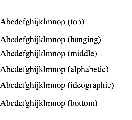 The value of text-baseline can refer to text-baseline, as shown in the figure below. For example, when taking the hanging value, the value of hangingBaseline is 0, and the value of alphabeticBaseline is the distance from alphabetic to hanging.