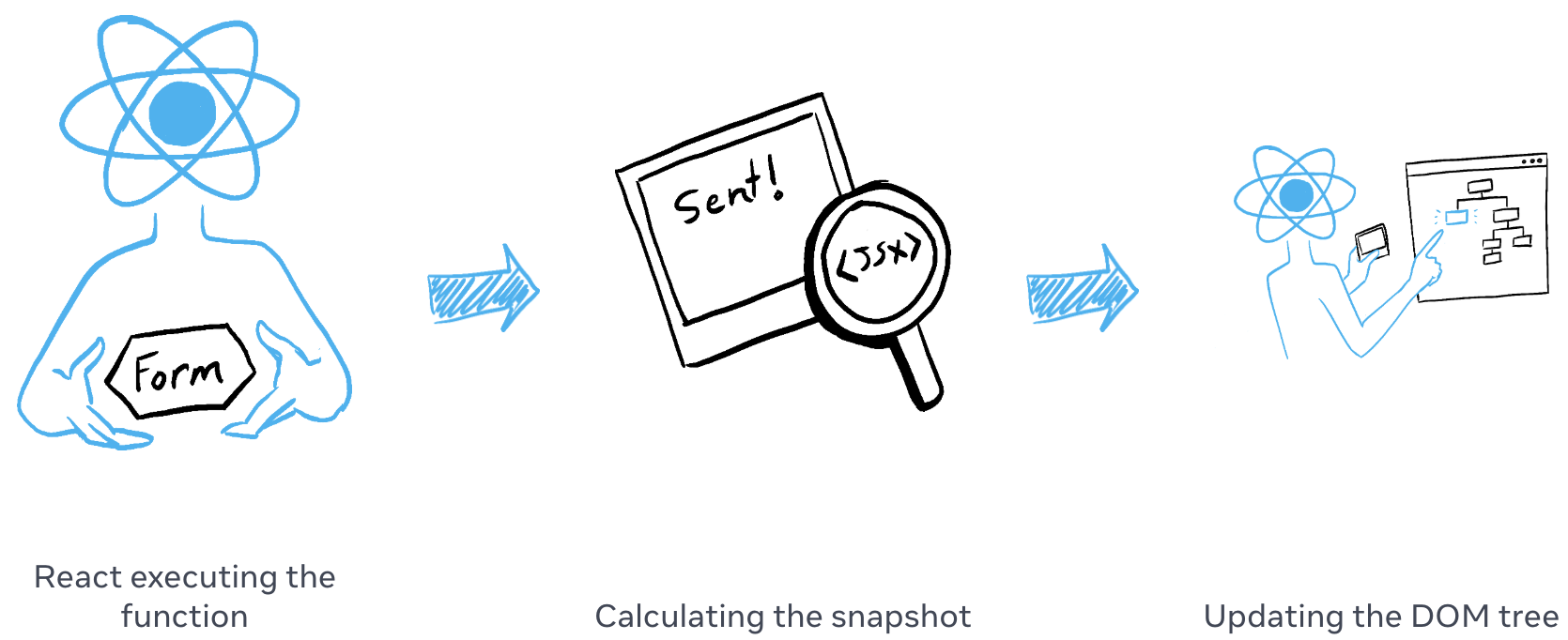 The following image from State as a Snapshot shows how the React render function executes and then takes a snapshot before updating the DOM tree: