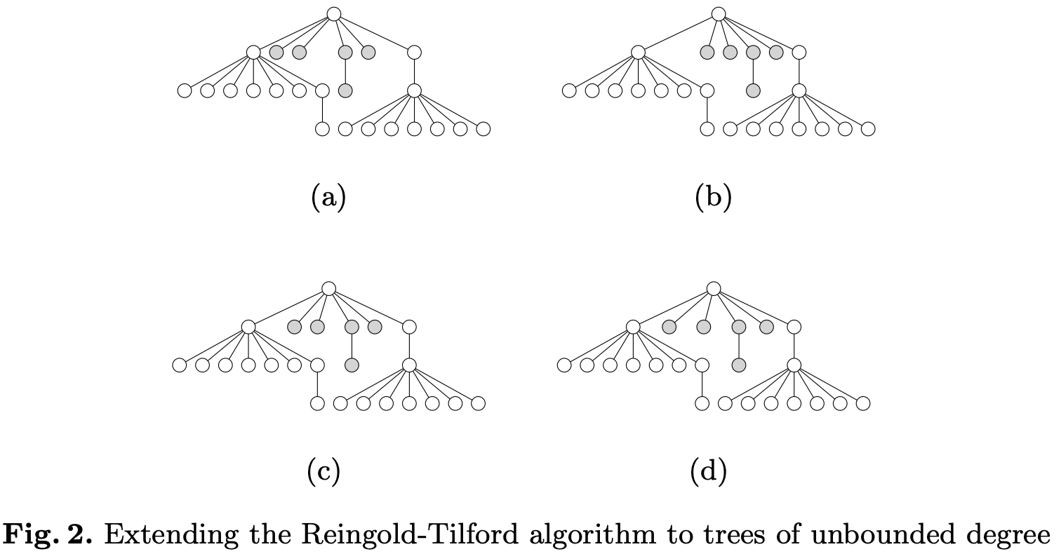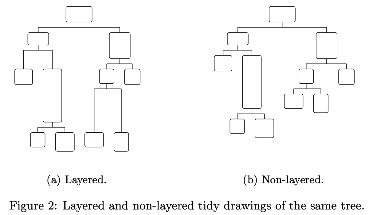 d3-tree's implementation approach comes from: Tidier Drawings of Trees, which proposes several aesthetic standards based on previous research: