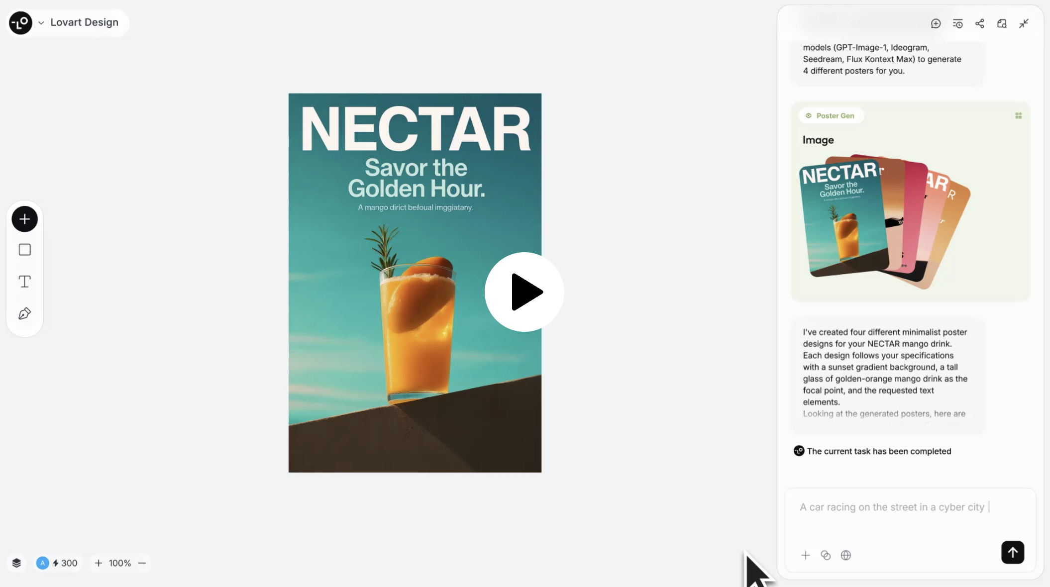 The image below shows Lovart's product interface, which uses Konva.js mentioned in our Lesson 21 - Transformer as the underlying technology. Although primarily focused on image editing, it doesn't abandon common features from graphic editors, such as the layer list hidden by default in the bottom left corner, and the left toolbar can also insert some basic shapes.