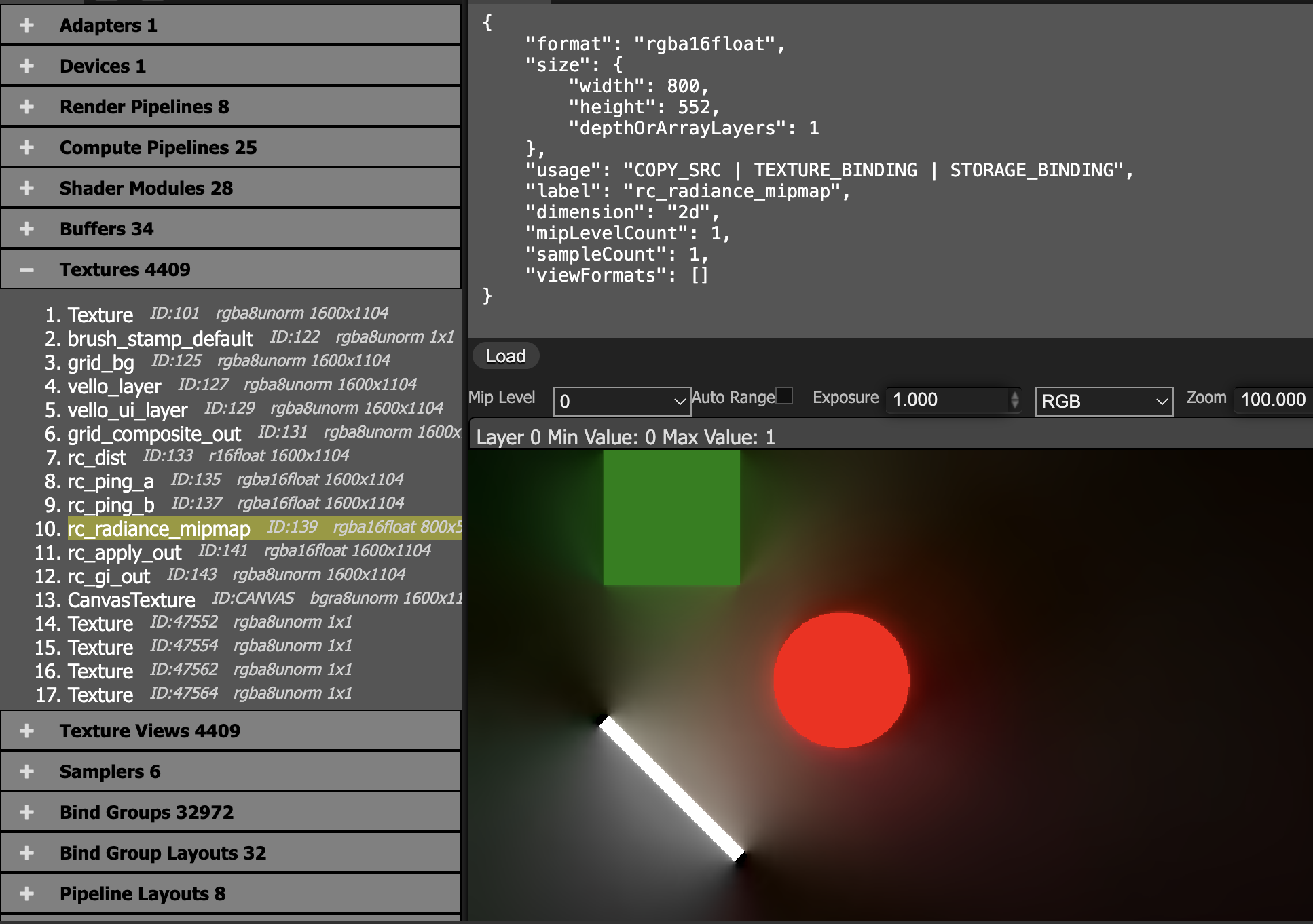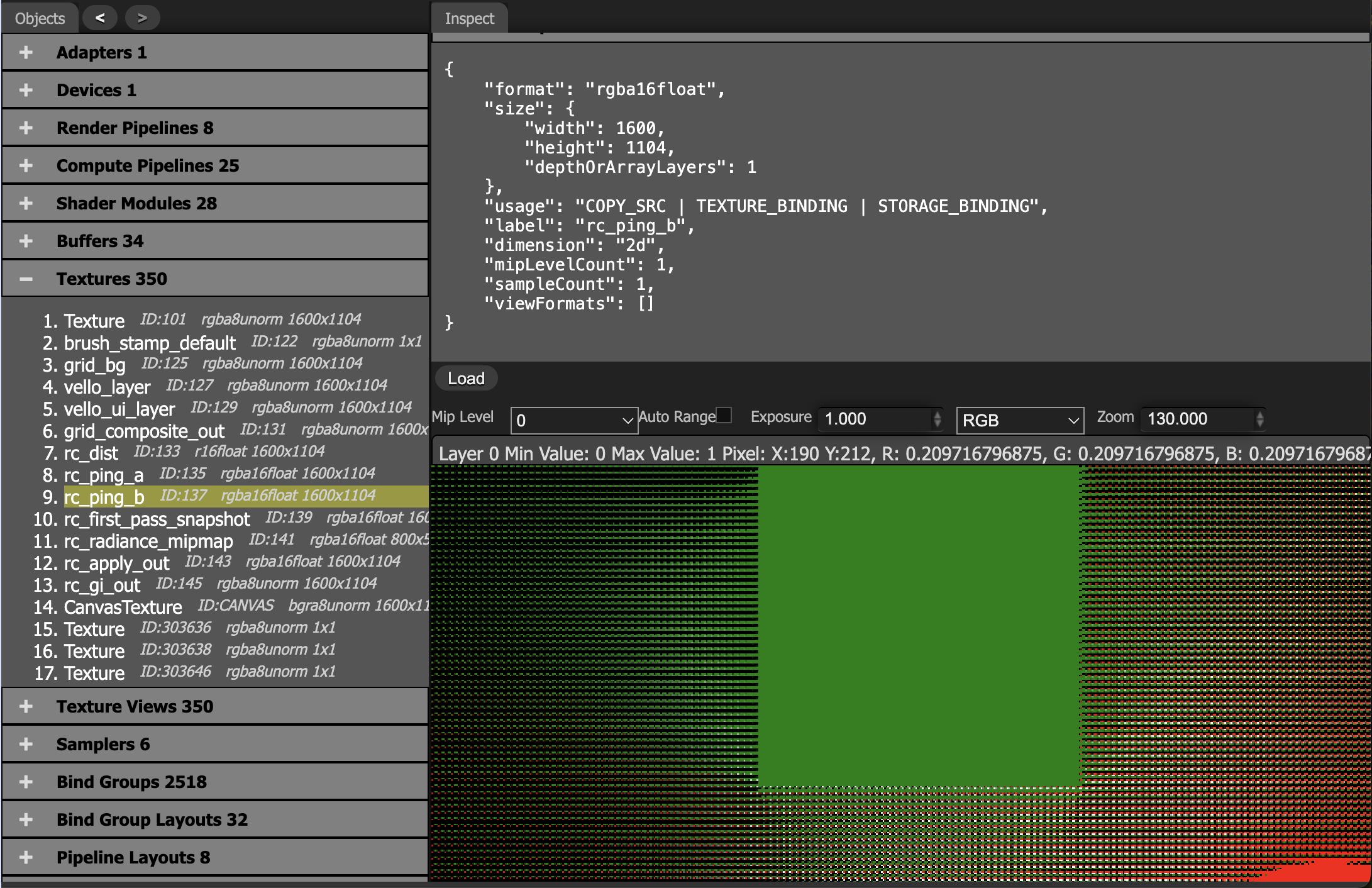With WebGPU Inspector, you can inspect the final merged result in rc_ping_b. You can clearly see that non-hit areas get filled in, producing smoother penumbra.