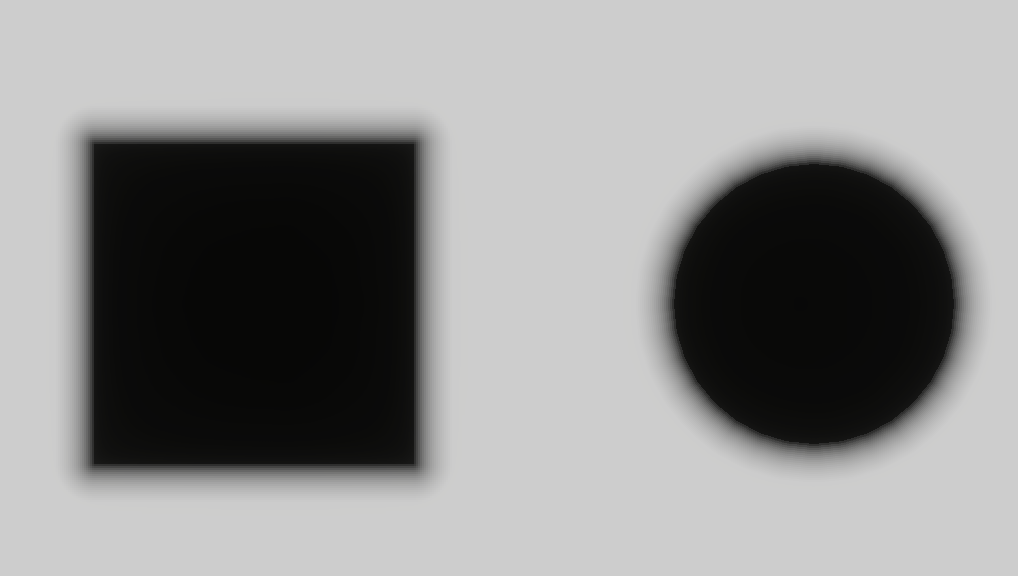 device_handle.queue.submit([rc_enc.finish()]);We start with analytic geometry. In Lesson 2 - Draw a Circle and Lesson 9 - Draw Ellipses and Rectangles, we already introduced SDFs for circles, ellipses, and rectangles. The distance is 0 on shape boundaries and inside shapes. The figure below visualizes it in grayscale, mapping raw distance into [0,1] with saturate(d * DIST_FIELD_VIZ_SCALE):